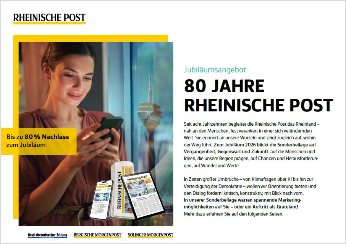 Zum 80. Jubiläum blickt die Rheinische Post auf das, was die Region geprägt hat – und auf das, was sie bewegt. Die Sonderveröffentlichung verbindet Vergangenheit, Gegenwart und Zukunft: mit starken Geschichten, relevanten Themen und hoher regionaler Aufmerksamkeit. Für Unternehmen entsteht ein Umfeld, das Vertrauen schafft und Zielgruppen direkt anspricht. Alle Details, Formate und Themen finden Sie in den ausführlichen Mediadaten zum Download.